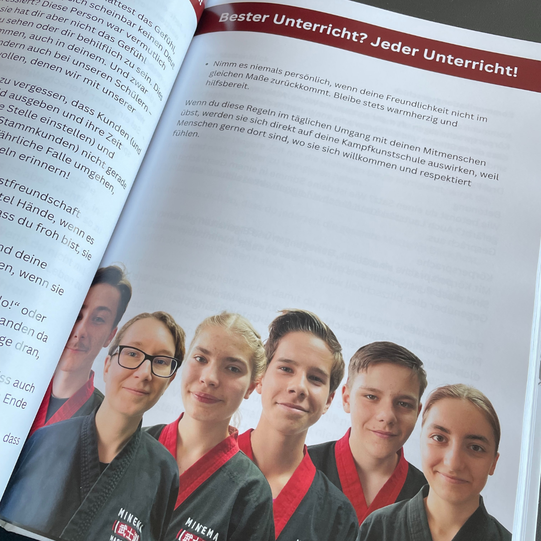 Als Mitglied des MINEMA-Leadership-Teams nehmen wir dich mit in die sprichwörtliche Küche unserer Kampfkunstschule. Oder ins Herzstück. Oder in den OP-Saal. Wir wollen dich in unser tiefgreifendes Wissen einweihen. Wie managen wir unsere Schule? Dieses Wissen darf nicht an andere Personen weitergegeben werden! Hier siehst du die Seite 51 vom MINEMA Leitfaden (Betriebsbuch).